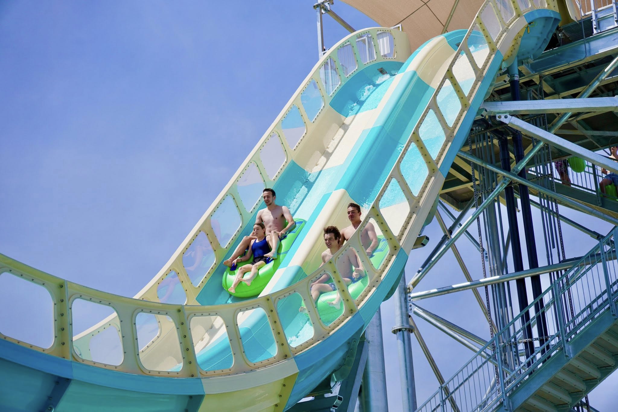 RiverRacers introduces a one-of-a-kind experience as Ohio’s only dual-racing water coaster. Riders launch side-by-side from a 48-foot-high platform, zooming down a 33-foot, 47-degree drop at speeds up to 30 mph. The ride’s course includes uphill water jet propulsion, enclosed tunnel sections with vibrant lighting effects, mirrored turns, and a thrilling 180-degree slingshot finale.