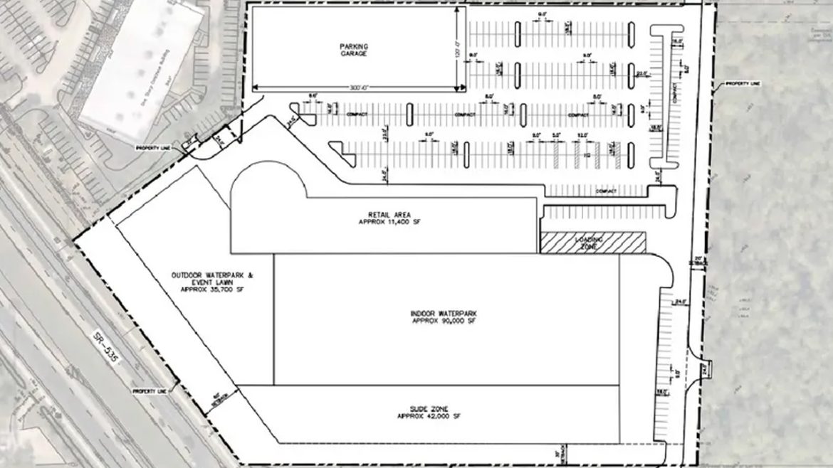 The documents describe the development as a tourist commercial resort featuring both indoor and outdoor water park elements. Beyond the water attractions, plans also include an outdoor gathering space, a retail store, and a family entertainment center, suggesting this won’t just be a quick splash-and-go experience.