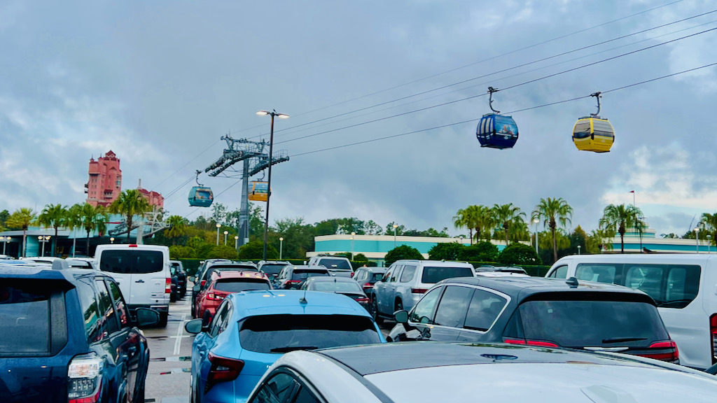 As we drove into the parking lot, I also got a nice look at the Skyliner moving overhead. Usually, I only catch glimpses of it while driving on Buena Vista Drive toward Disney Springs or passing through the area, so it was nice seeing it up close in action. That is definitely a Disney transportation experience I still want to make time for on a future trip. I already know I would rather do that on one of these cooler days than in the middle of a blazing hot summer afternoon.
