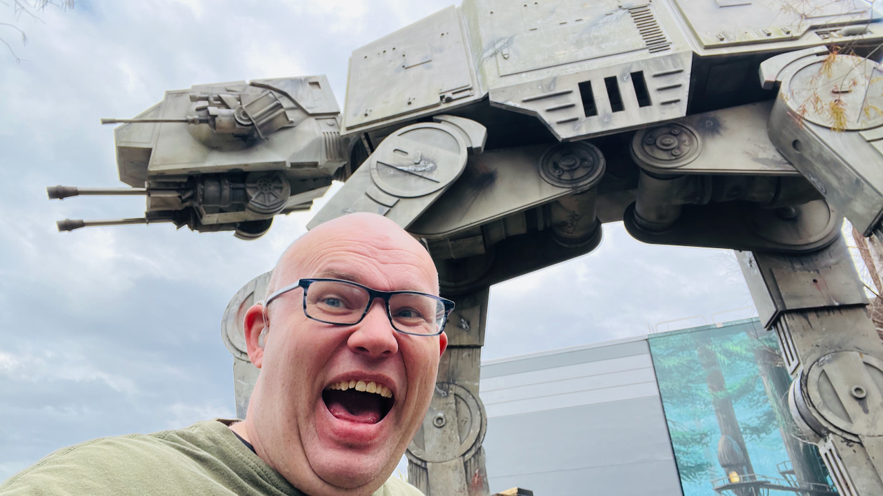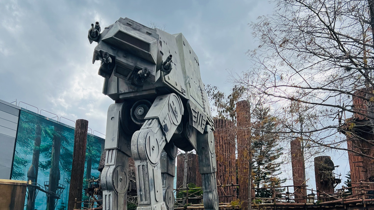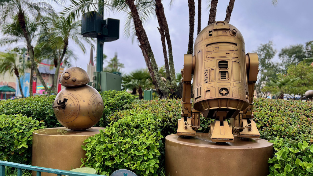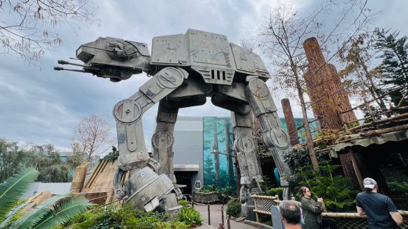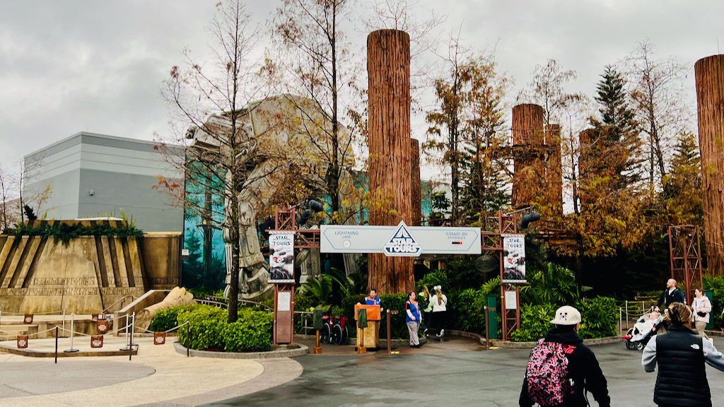 As we made our way toward Star Wars: Galaxy’s Edge through Grand Avenue, it was nice to see Star Tours still standing there with the AT-AT towering nearby. Before Galaxy’s Edge existed, Star Tours was the Star Wars anchor of the park, so there was something cool about seeing it still holding its place even as the park has evolved around it.