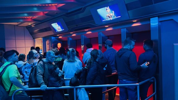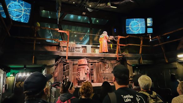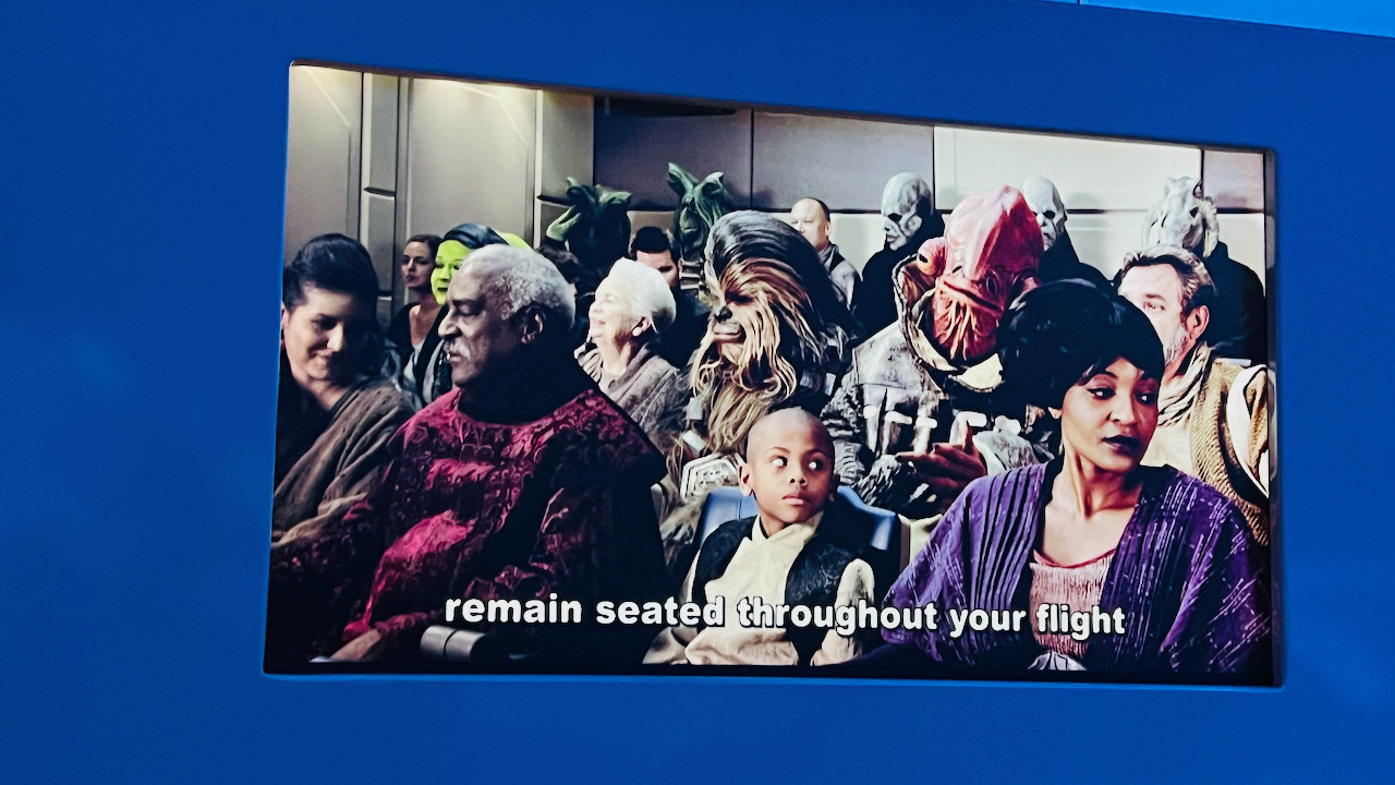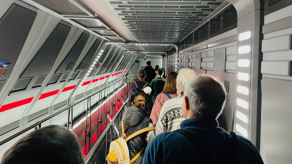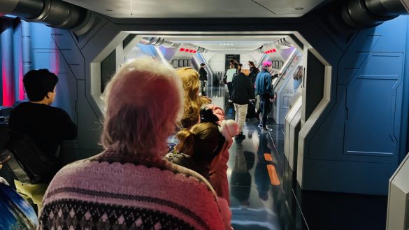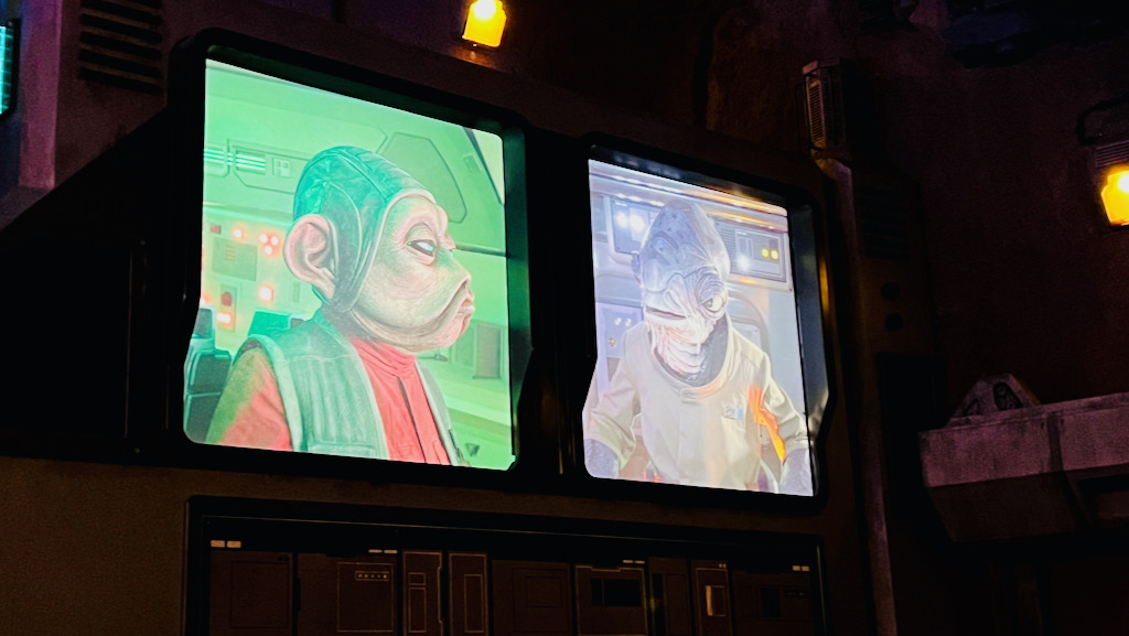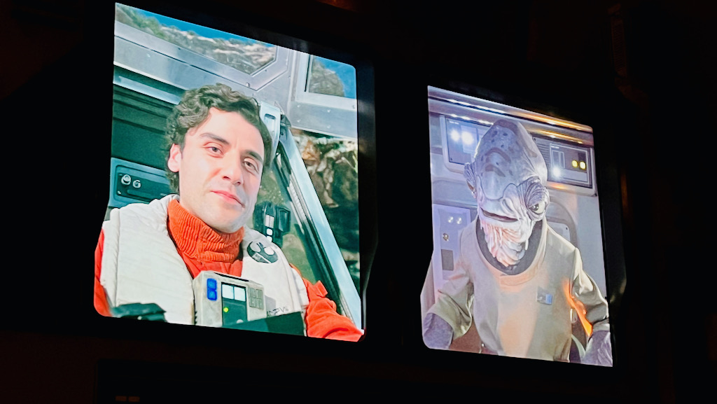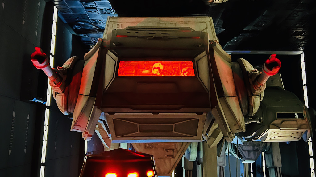 Once it was our turn, we picked up our 3-D glasses, or “flight glasses,” and headed to our gate. The pre-boarding video still has that humorous in-universe charm to it, which is part of what makes Star Tours memorable even before you board.