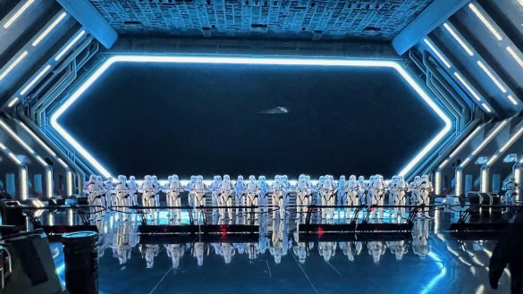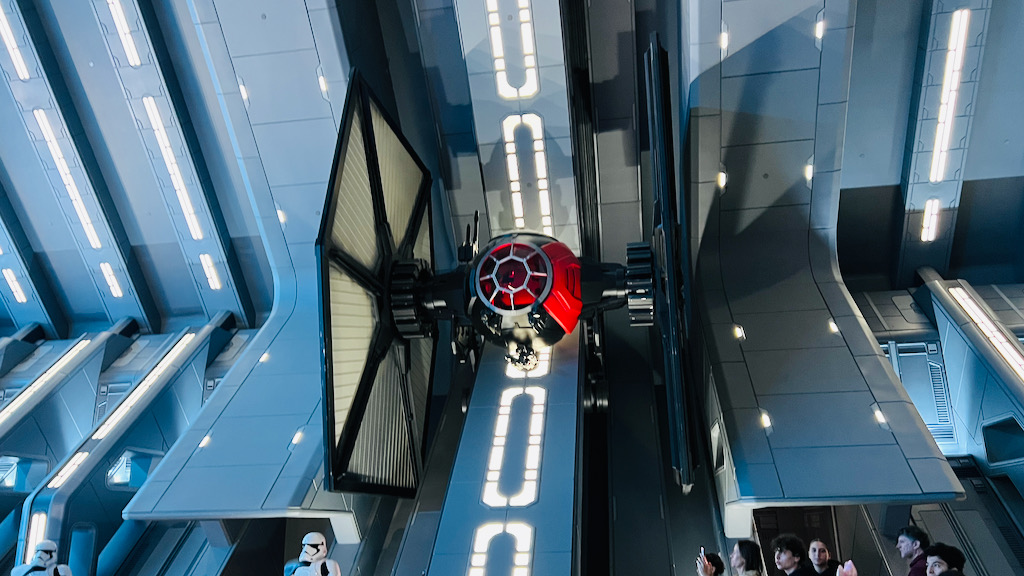 Walking off the transport into that massive room is absolutely jaw-dropping. The scale is enormous. Rows of Stormtroopers stand in formation. A TIE fighter is parked nearby. Star Destroyers can be seen beyond the hangar windows. It is one of those theme park reveal moments that genuinely takes your breath away.