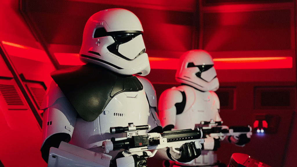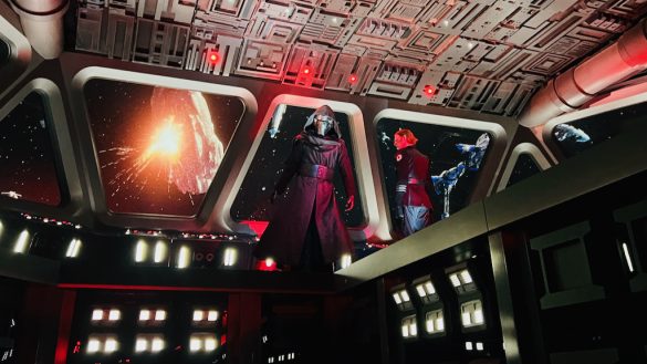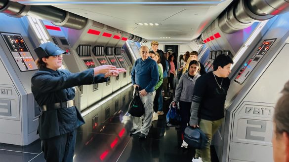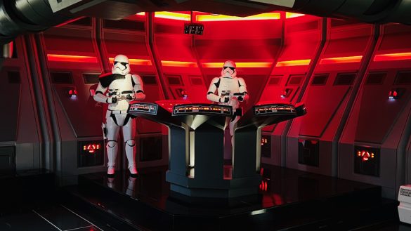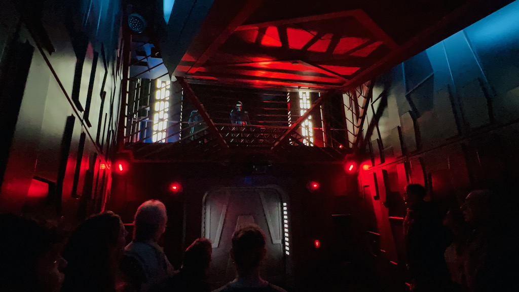 Once aboard the transport, things seem to be under control for about a minute before the First Order intercepts the ship and everything goes wrong. Lieutenant Bek appears, and the tension builds quickly as the mission unravels. Then comes one of the ride’s most unforgettable moments: the arrival inside the Star Destroyer hangar.