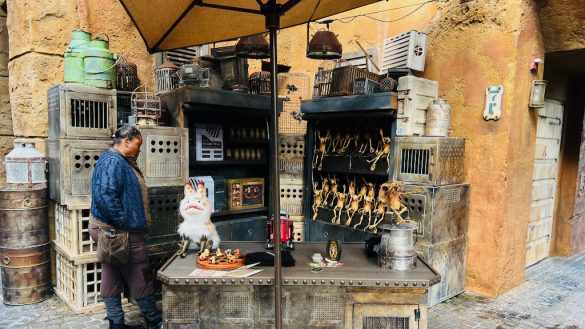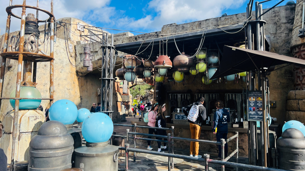 As we walked through the rest of the land, we also passed by food spots like Ronto Roasters and the Milk Stand. Ronto Roasters stands out immediately because of its wild visual setup, using a podracing engine and smelter droid to grill meats over a giant barbecue pit. That kind of weird, creative storytelling detail is part of what makes Galaxy’s Edge so much fun to explore.