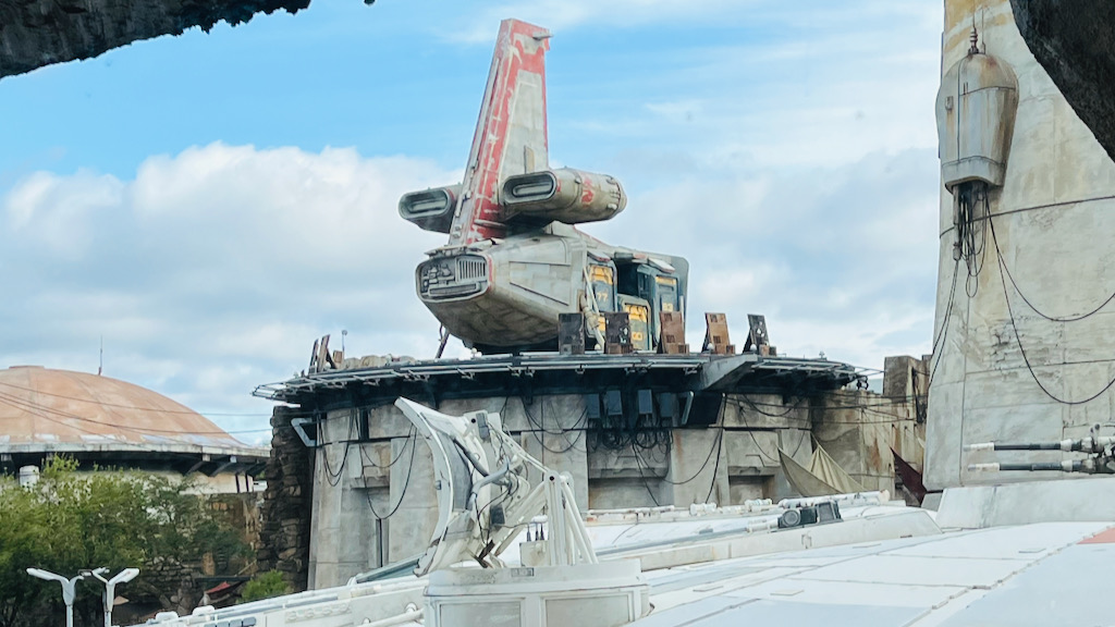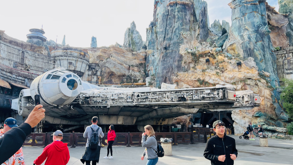 You can see photos and videos of it all day long, but none of that fully prepares you for standing there in front of the Falcon for the first time. It is one of those instantly iconic theme park visuals that makes you stop and just appreciate where you are. We also found the hidden mini Millennium Falcon, which was fun to spot in person. It was covered in dirt and debris, but honestly that fits Galaxy’s Edge perfectly.