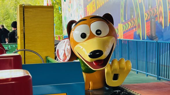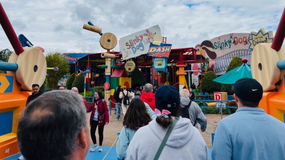 We had hoped to ride Slinky Dog Dash right away, but it was temporarily down, so we headed over to Alien Swirling Saucers instead. The queue there was neat in its own right, especially with the way it makes you feel like you are standing inside toy packaging for the aliens.