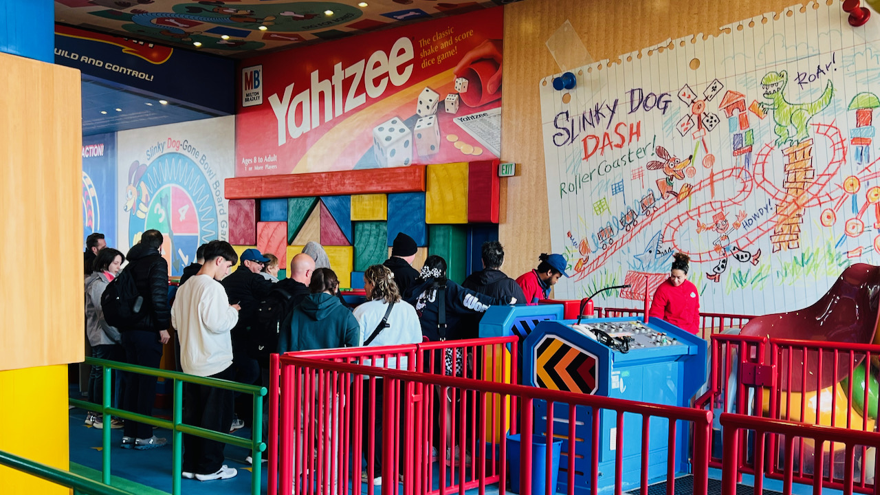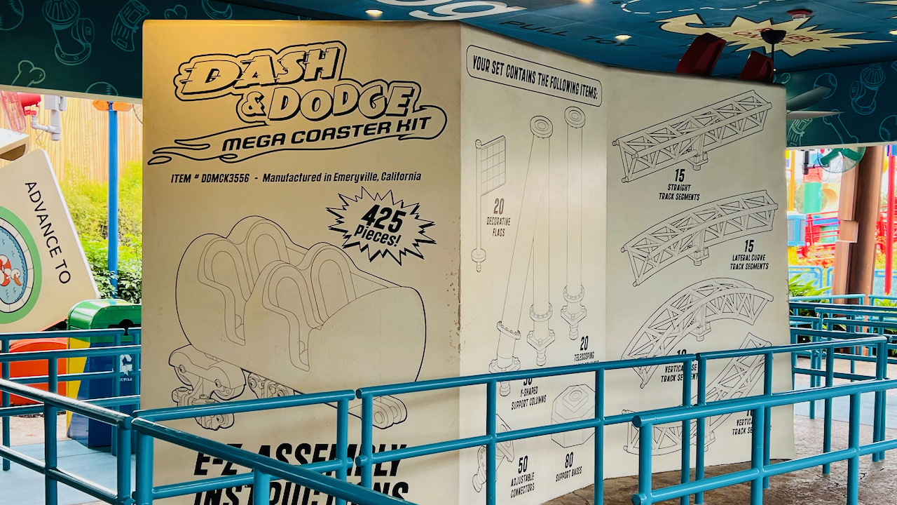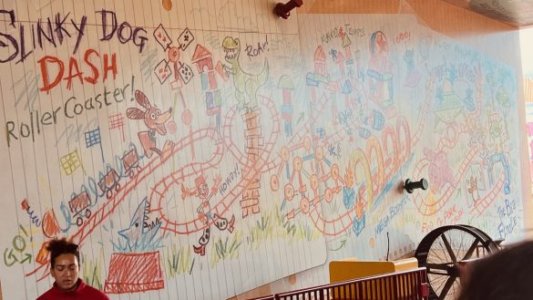The queue for Slinky Dog Dash is full of great details once you really start paying attention. From the Elmer’s Glue to the ride blueprints overhead to the toy package theming, it all helps tell the story that you are about to ride a roller coaster built by Andy using his toys and imagination.