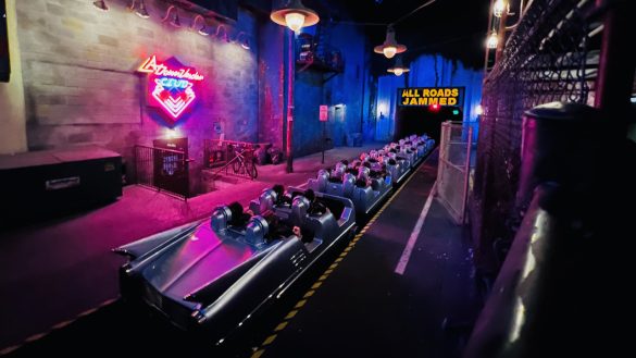 That launch is still the big moment. Going from zero to sixty in just a few seconds is a rush every single time. Then you are immediately thrown into darkness, twists, inversions, road signs, and neon-lit chaos. It is fast, loud, and a whole lot of fun.
